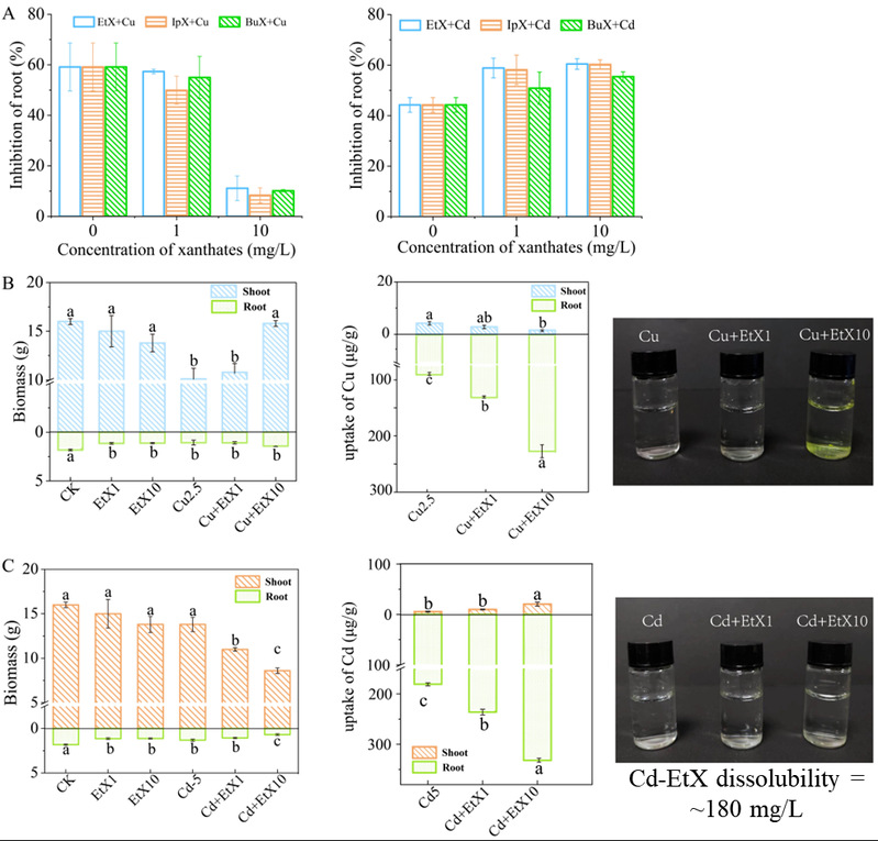 Figure 1: Effects of combined exposure to Cd and xanthates on cabbage root growth and heavy metal accumulation.
