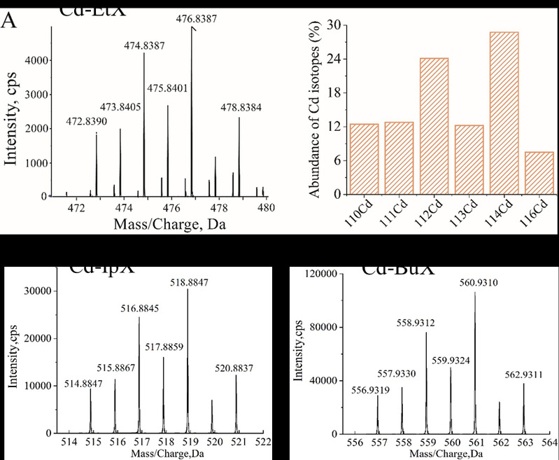 Figure 3: High-resolution mass spectra and natural Cd isotope patterns for Cd–xanthate complexes.