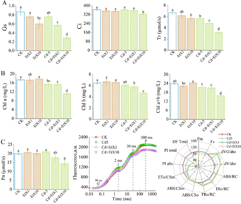 Figure 2: Impact of Cd–ethyl xanthate combined stress on transpiration, chlorophyll content, and photosynthesis.