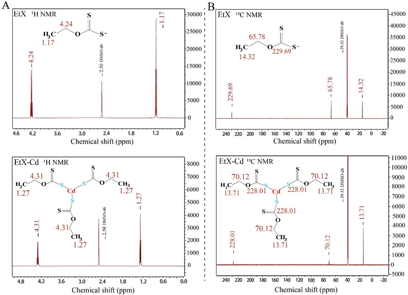Figure 4: NMR spectra showing chemical shift changes upon Cd–ethyl xanthate coordination.