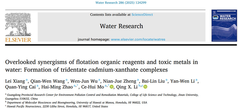 A groundbreaking study led by Professor Xiang Lei from the research team of Professor Mo Cehui at Jinan University has been published in Water Research, a top-tier international journal in environmental science. The study systematically uncovers, for the first time, the synergistic toxic effects and underlying molecular mechanisms between xanthates—typical organic flotation agents used in mining—and the heavy metal cadmium (Cd). It reveals that xanthates and Cd can form soluble tridentate coordination complexes, which significantly enhance Cd accumulation in crops and lead to synergistic toxicity. These findings offer new insights for ecological risk assessment and pollution control related to organic flotation agents in mining activities.