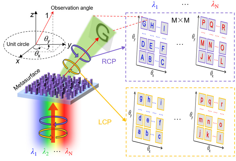 To address this challenge, the research team developed an efficient gradient optimization algorithm capable of co-optimizing the geometric parameters of millions of nanounits on the metasurface. This design enables the device to exhibit distinct, pre-defined optical functions based on the incident light's wavelength, polarization, and observation angle, achieving independent control over the three optical dimensions with low inter-channel crosstalk.