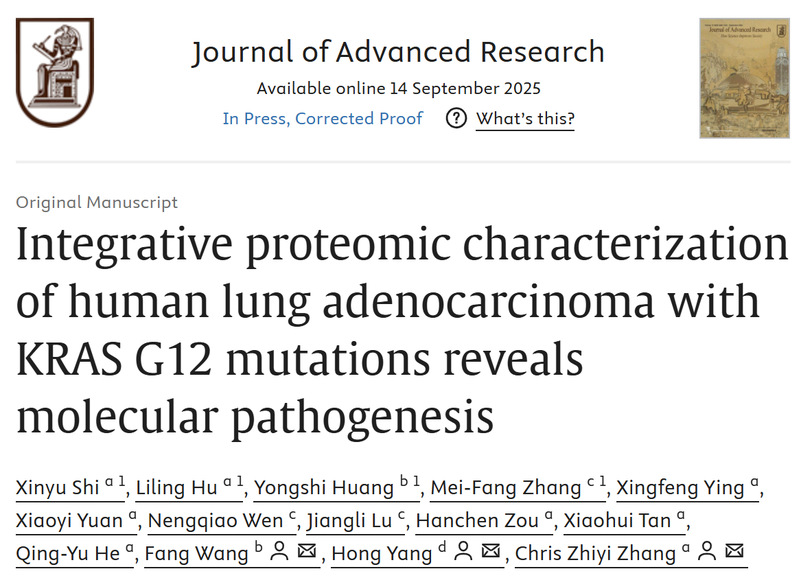 In a study published in the international journal Journal of Advanced Research (CAS Q1, Impact Factor 13.0), a research team led by Dr. Zhang Zhiyi and Dr. He Qingyu from the Department of Biochemistry, College of Life Science and Technology, Jinan University, reported a comprehensive proteomic characterization of KRAS G12-mutant lung adenocarcinoma.