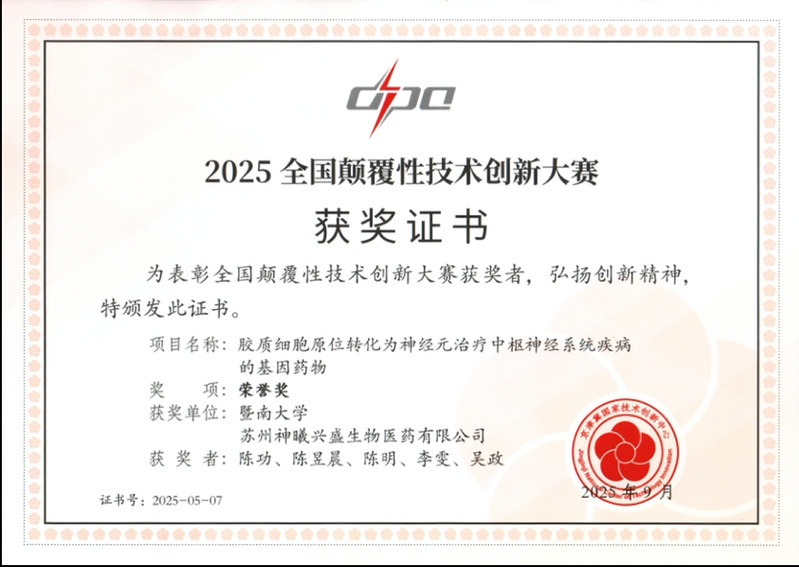 On November 6, 2025, a collaborative project between Professor Chen Gong’s team from Jinan University and NeuExcell Therapeutics was awarded the highest prize—the Honor Award—in the 2025 National Disruptive Technology Innovation Competition. Titled “Gene Therapy for CNS Diseases via In Situ Conversion of Glial Cells into Neurons,” the project emerged victorious from a pool of over 2,200 submissions from 120 cities across China, becoming one of only four recipients of this top honor.